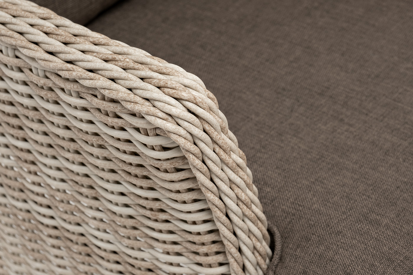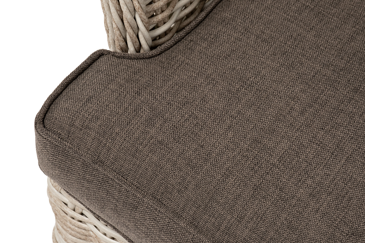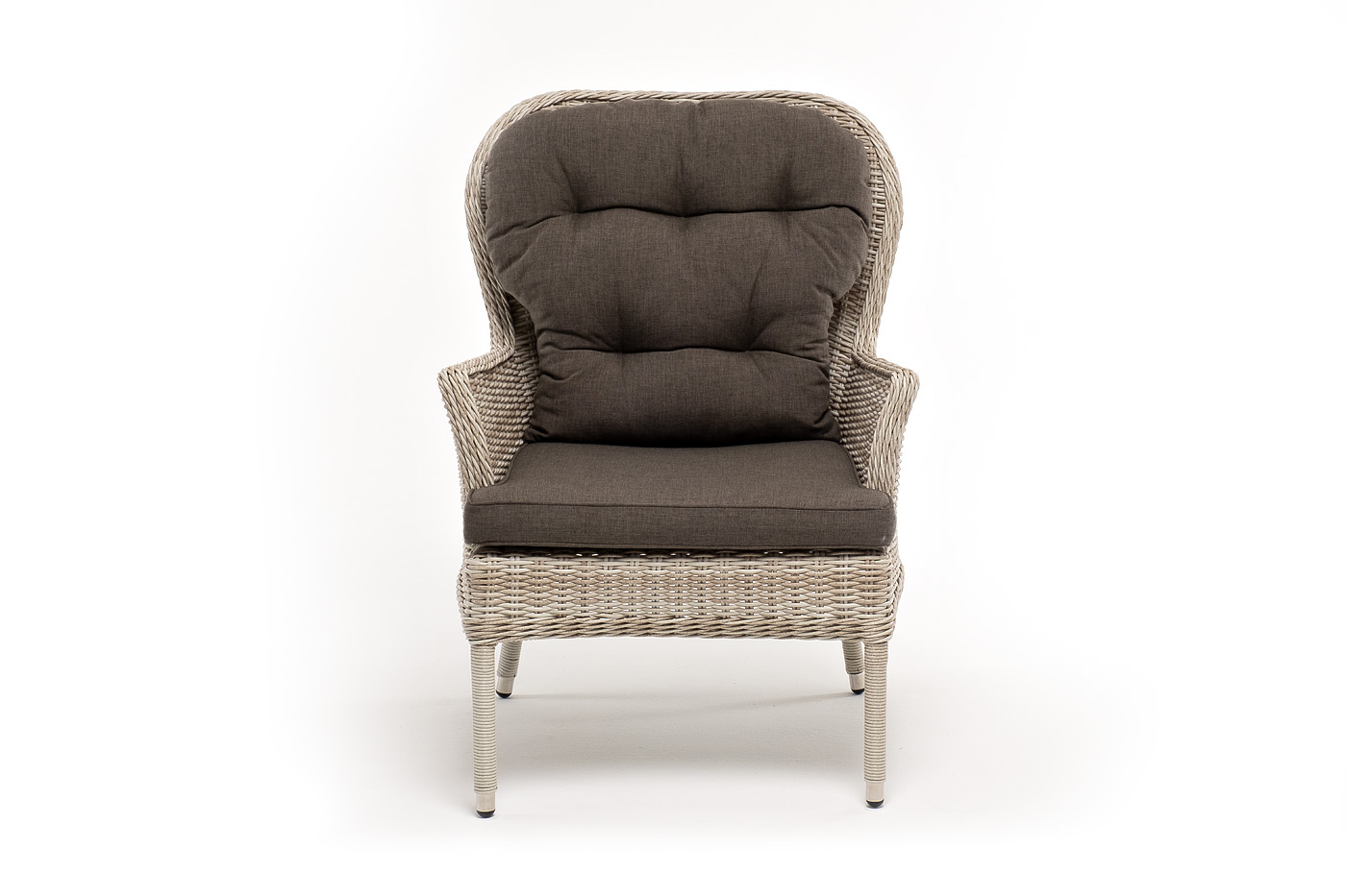 В садовое кресло укомплектовывается мягкими подушками. Они пошиты из износостойкого полиэстера серо-коричневого оттенка с плотностью 230гр/м2. Защитные свойства синтетического материала усиливаются благодаря влагоотталкивающей пропитке.